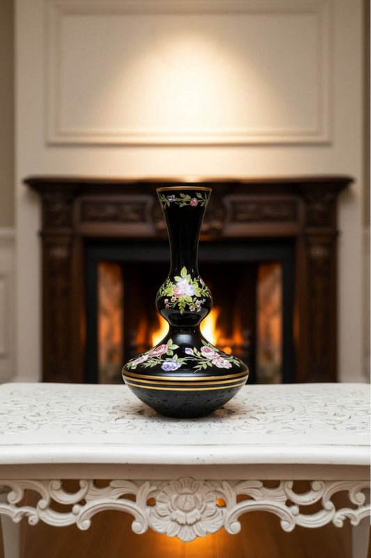 50 Yıllık Osmanlı Tarzı El İşlemeli Vazo – Altın Yaldızlı, Siyah Zeminli Koleksiyon Parçası