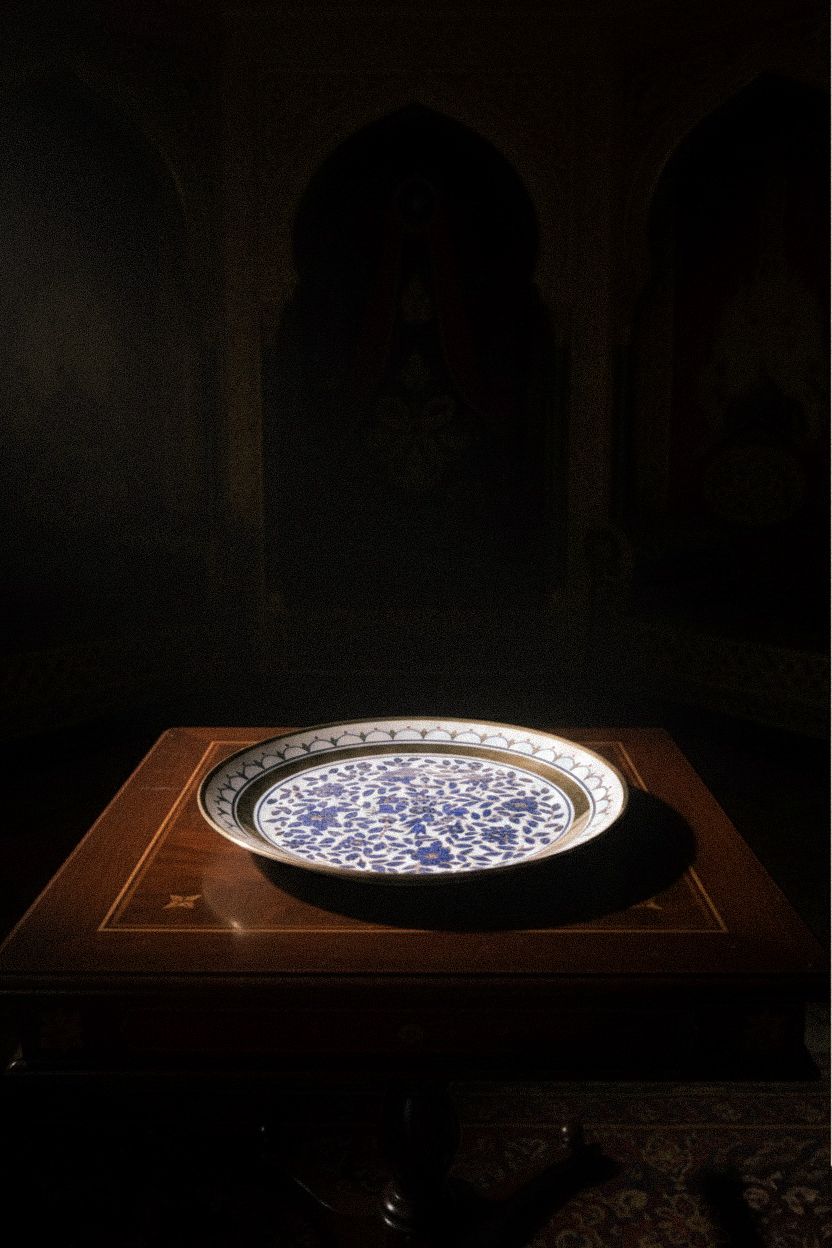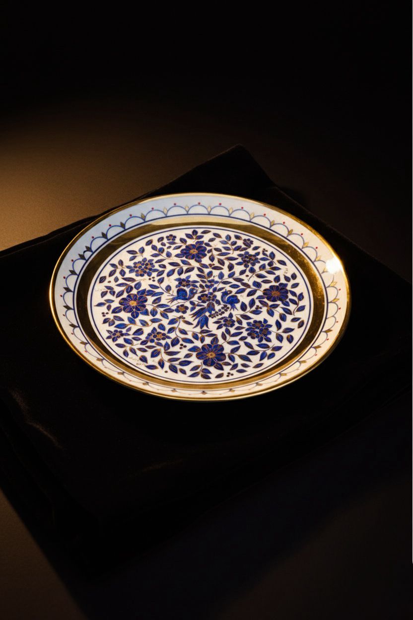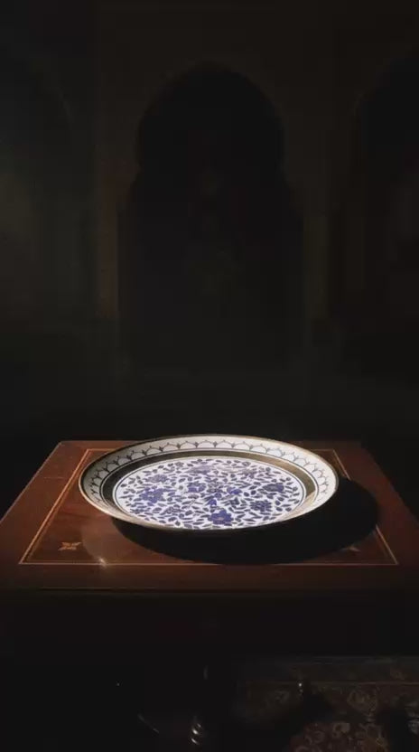 Bu zarif 2002 yapımı Osmanlı tarzı porselen tabak, geleneksel Türk sanatının modern dönemde üretilmiş en özel örneklerinden biridir. Merkezinde yer alan zengin mavi çini motifleri, çiçek desenleri ve ince altın yaldız işçiliği tabak üzerinde etkileyici bir derinlik ve zarafet oluşturur.