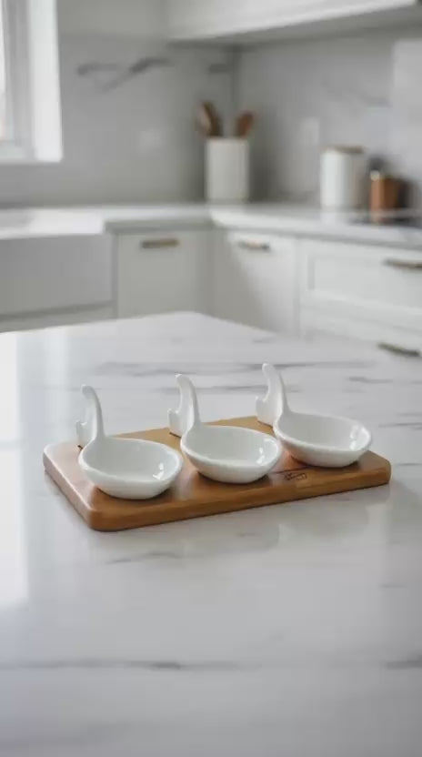 3’lü Porselen Sosluk ve Bambu Sunum Seti – Sofralara Şıklık ve Düzen