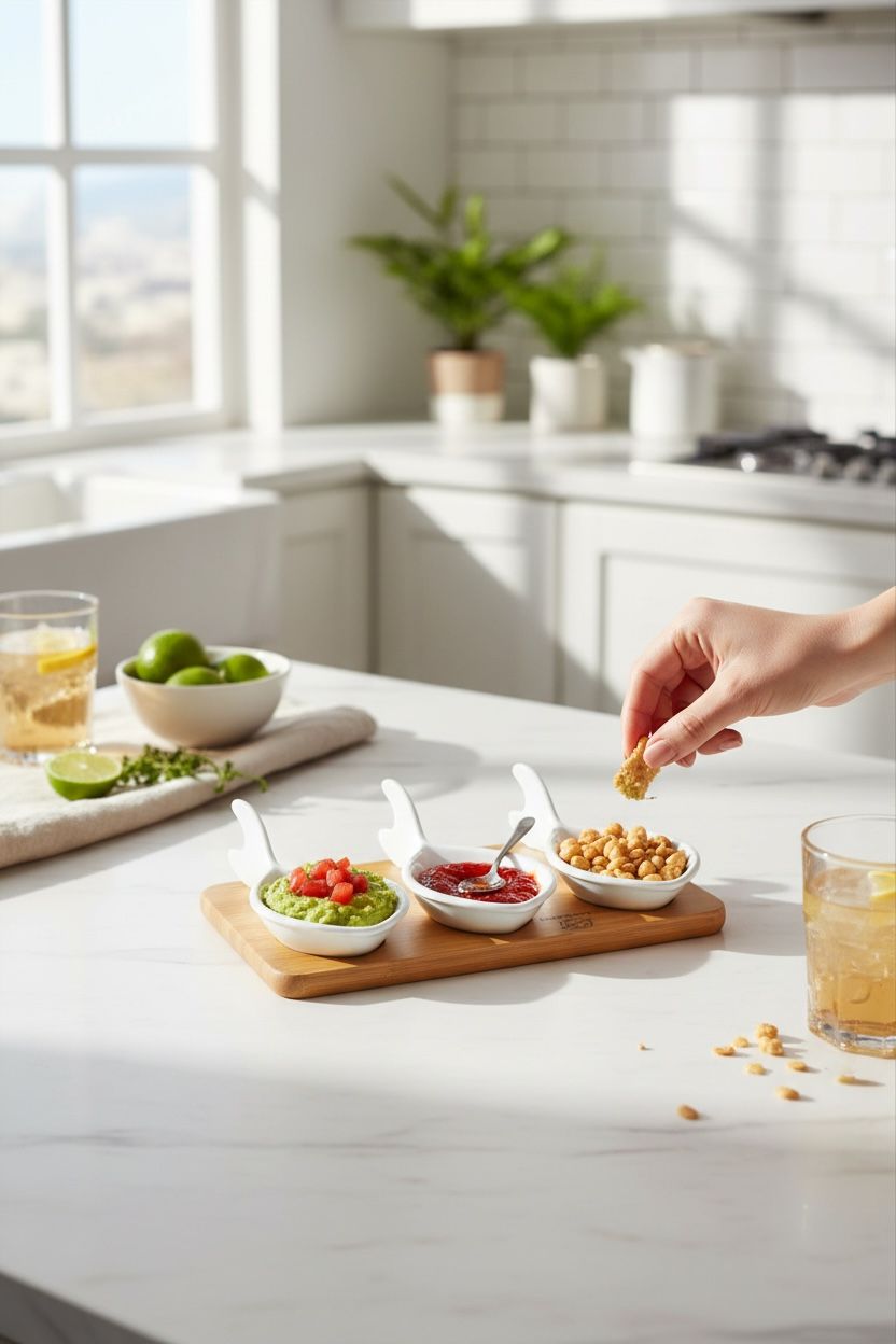 Bu zarif 3’lü porselen sosluk seti, hem günlük sofralar hem de özel davetler için şık bir sunum çözümü sunar. Beyaz porselen kaplar; soslar, mezeler, baharatlar, zeytin, peynir ve atıştırmalıklar için mükemmel ölçüde tasarlanmıştır. Dayanıklı bambu sunum tahtası, seti modern ve doğal bir görünümle tamamlar.