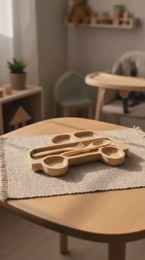 Araba Figürlü Bambu Bebek Mama Seti – Bölmeli Tabak + Kaşık Çatal Seti