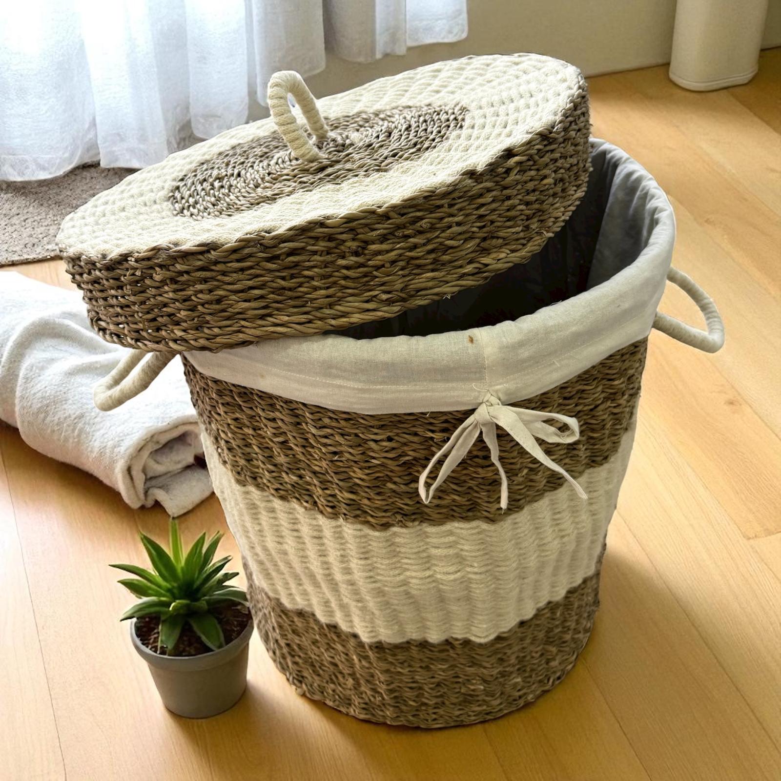 🧺 El Yapımı Doğal Yuvarlak Hasır Kapaklı Çamaşır Sepeti