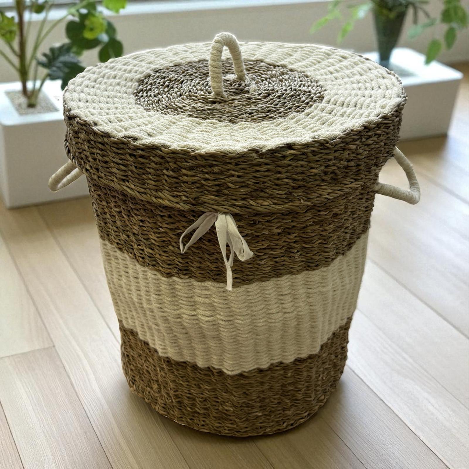 Bu el yapımı yuvarlak hasır çamaşır sepeti, su otu lifleriyle özenle örülmüş doğal dokusu ve beyaz örgü detaylarıyla zarif bir görünüm sunar. Modern boho tarzıyla banyonuzda, yatak odanızda veya çamaşır alanınızda sıcak bir atmosfer yaratır.