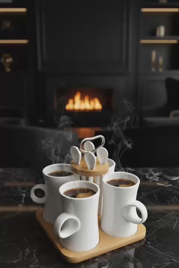 Modern Lüks Kahve Fincan Seti – 4’lü Porselen Fincan + Bambu Stand & Kaşık Seti