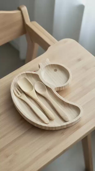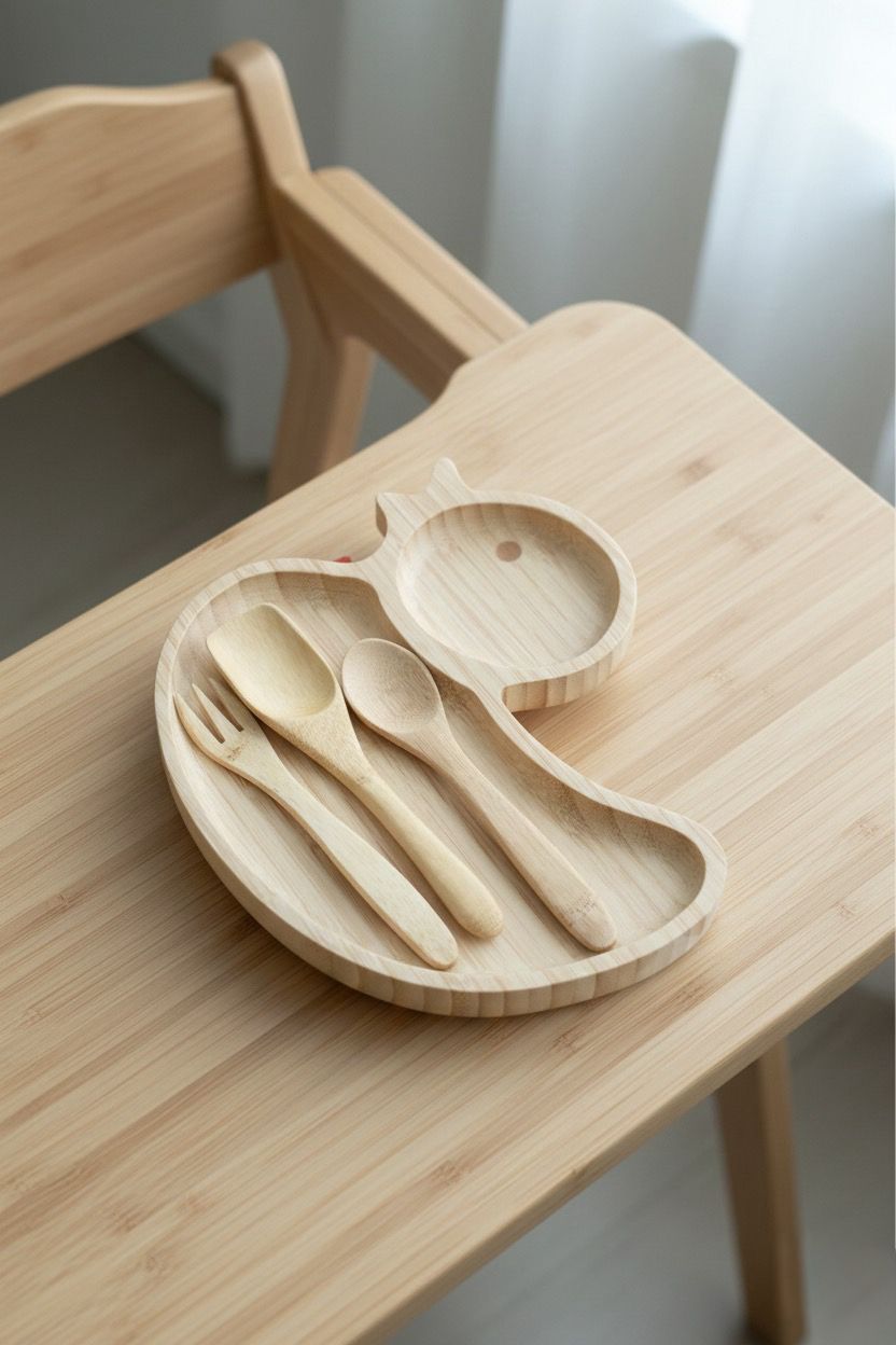 Set içerisindeki bambu kaşık, çatal ve derin kaşık; küçük ellere özel ergonomik tasarımla geliştirilmiştir ve bebeğinizin kendi kendine yeme becerisini destekler.