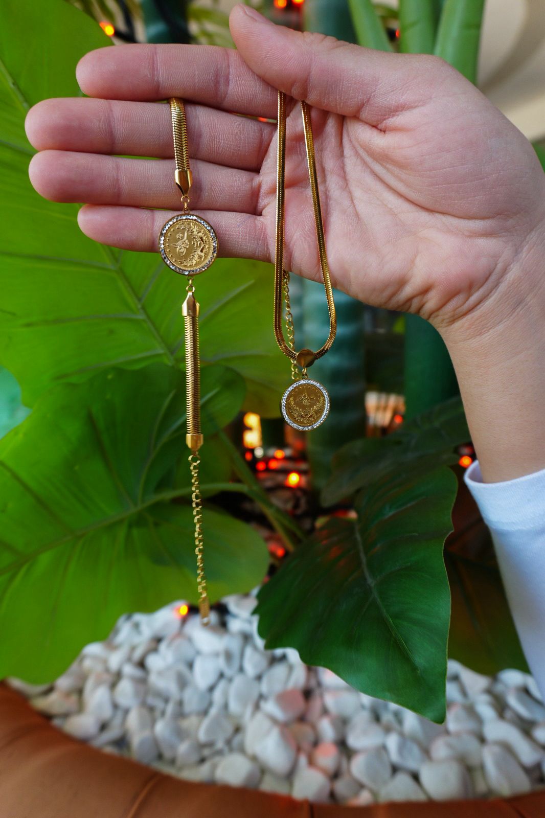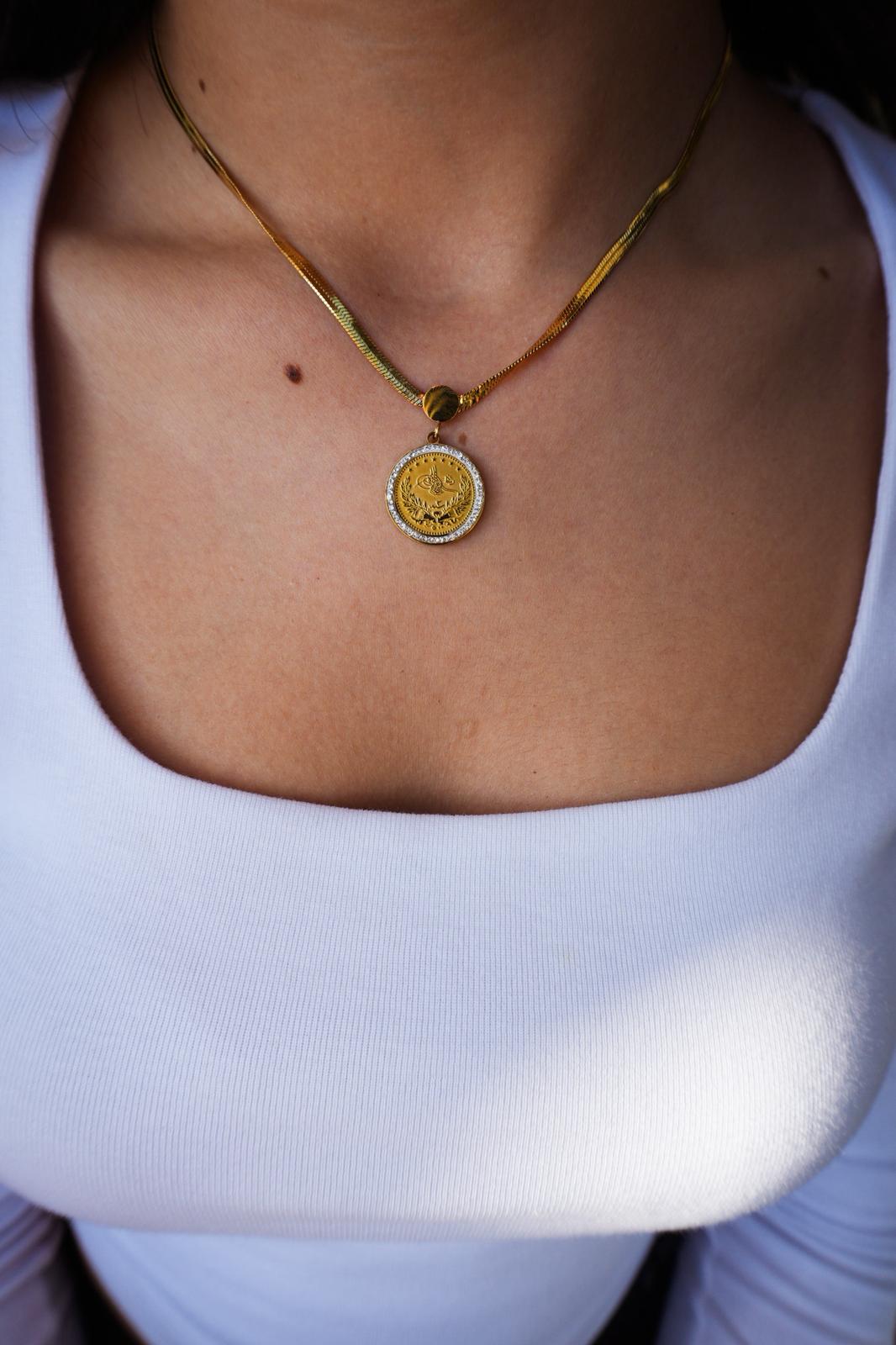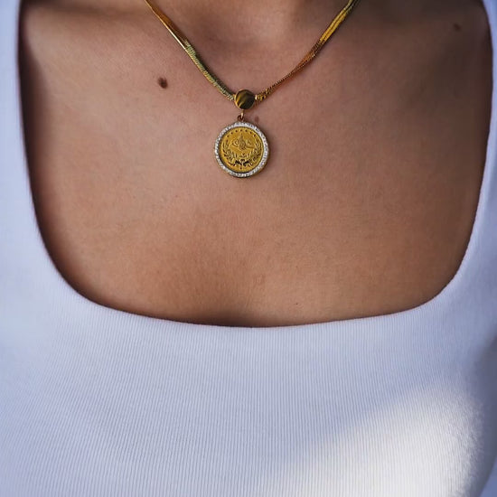 Asaletin ve tarihin simgesi olan Osmanlı tuğralı kolye ve bileklik seti, klasik şıklığı modern tasarımla buluşturur. Özel işçilik detaylarına sahip madalyon formu, gold kaplama yüzeyiyle ışığı zarif şekilde yansıtarak dikkat çekici bir görünüm sunar.